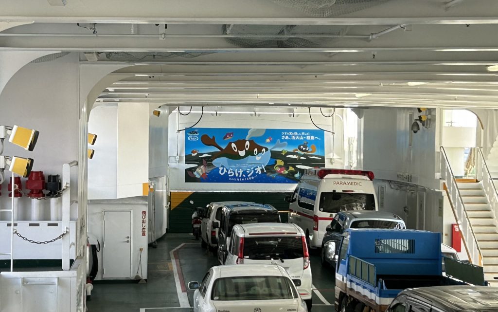 第二桜島丸(サクラフェアリー)の車両看板一階に桜島・錦江湾ジオパークPR看板を設置しました。